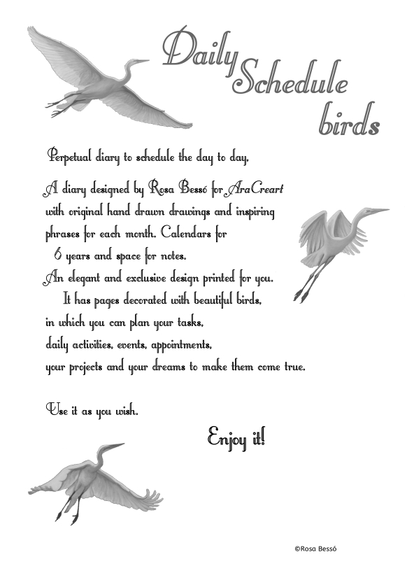 Té les pàgines decorades amb hermoses aus (Martinets o Àguiles), o hermoses flors (Freesies o Magnòlies),